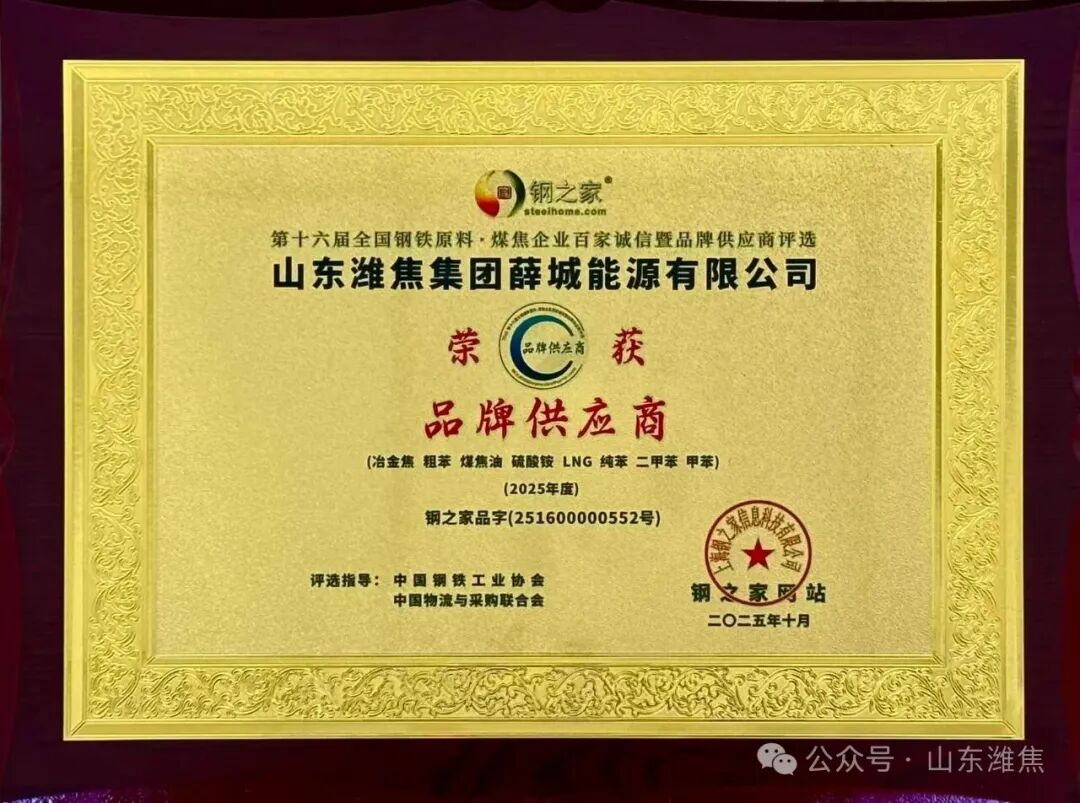 近日,“鋼之家第十六屆全國鋼鐵原料煤焦企業(yè)百家誠信暨品牌供應商”評選活動順利舉行,經(jīng)鋼之家網(wǎng)站征信取證,中國鋼鐵工業(yè)協(xié)會及中國物流與采購聯(lián)合會專家綜合評審,山東濰焦集團薛城能源有限公司被評為2025年度“品牌供應商”殊榮。榮譽證書